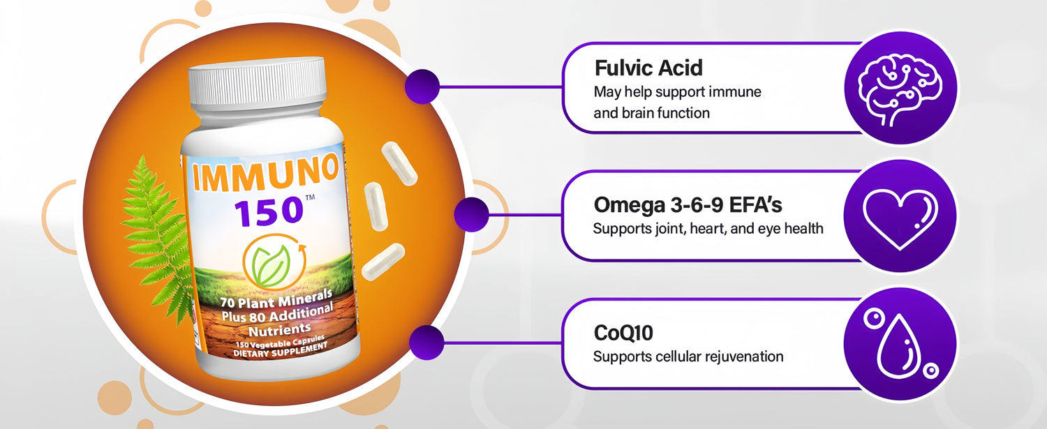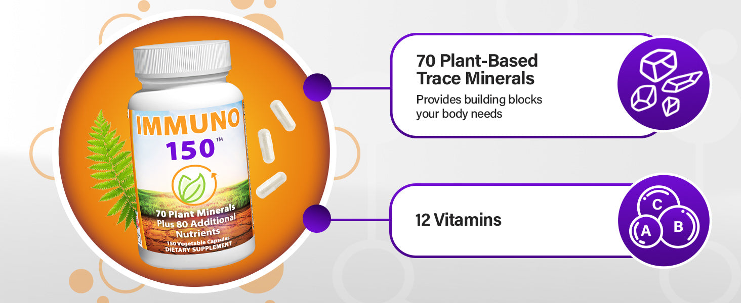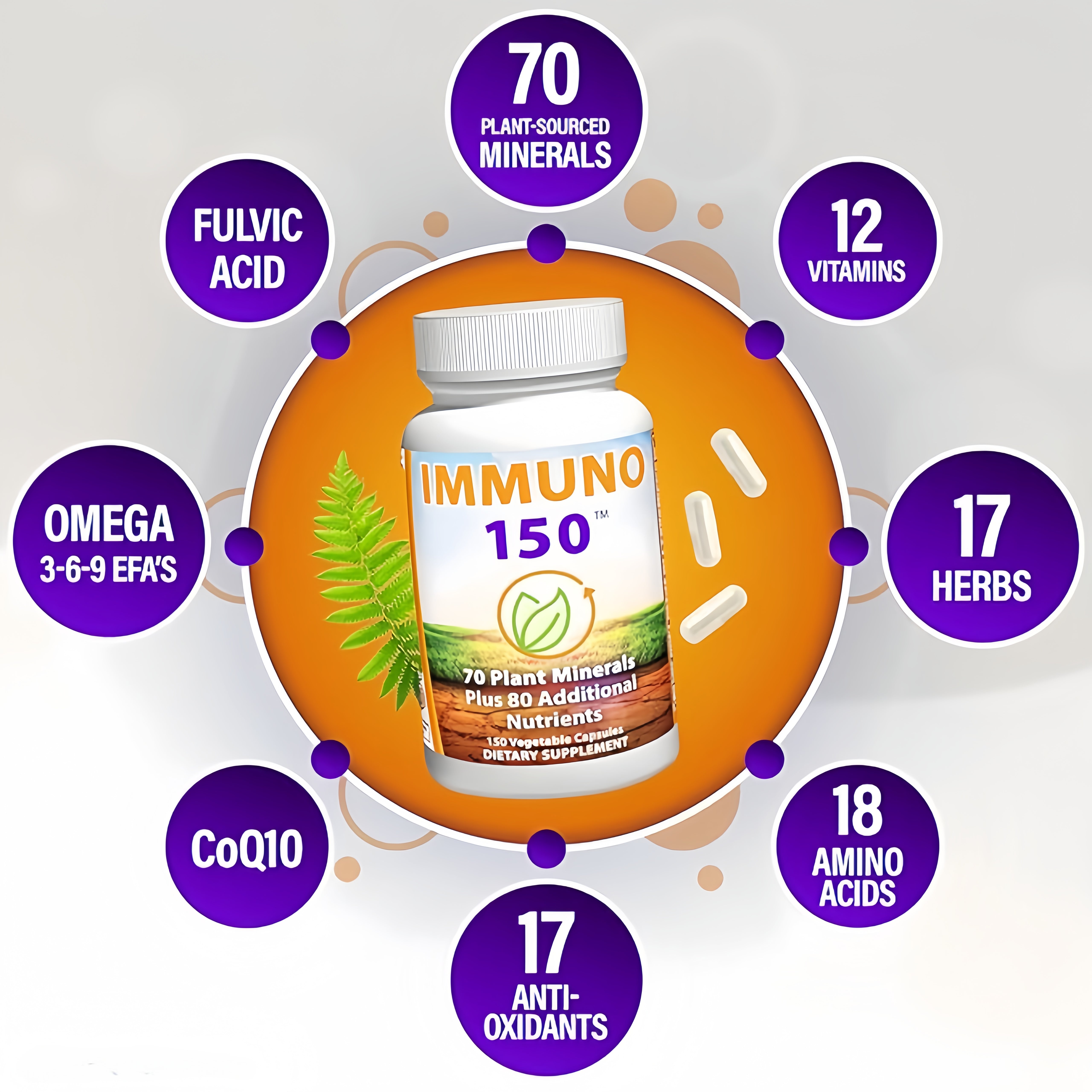 Immuno150 is powered by 70 organic colloidal plant minerals, blended with over 80 essential nutrients including vitamins, antioxidants, amino acids, and herbs. Each capsule is made with non-toxic, Kosher-certified, USDA-approved ingredients, crafted in an FDA-certified facility for purity, safety, and quality you can trust.